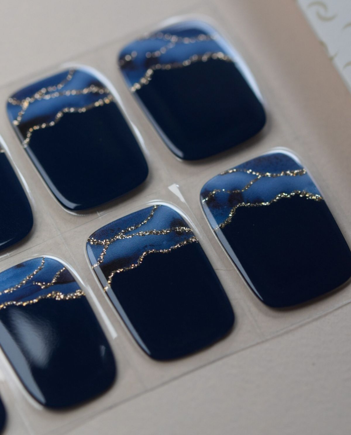 Cosmic Wave kombiniert ein sattes, tiefes Blau mit feinen, geschwungenen Akzenten in Goldoptik. Das Design wirkt ruhig und gleichzeitig ausdrucksstark – inspiriert von kosmischen Bewegungen und sanften Wellen im Dunkel der Nacht.